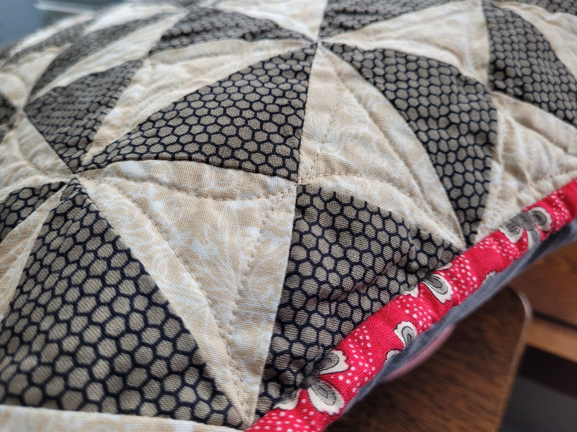 This pillow has a matching one in a reverse colour scheme (see last photos). Mirroring the same elegant design of the Classic Hearth Quilt, and utilizing the same high-quality black, red, and gray floral cottons on a beige ground. They offer the perfect touch of curated colour and soft texture for your sofa or bed. Simple overlapping backs ensure easy cleaning and long-lasting beauty. (Note: Insert included!)