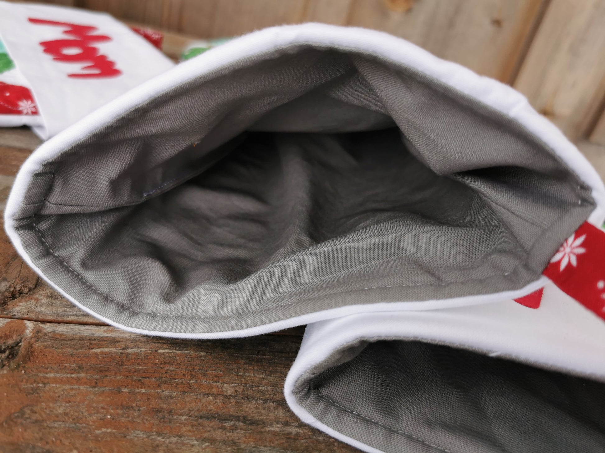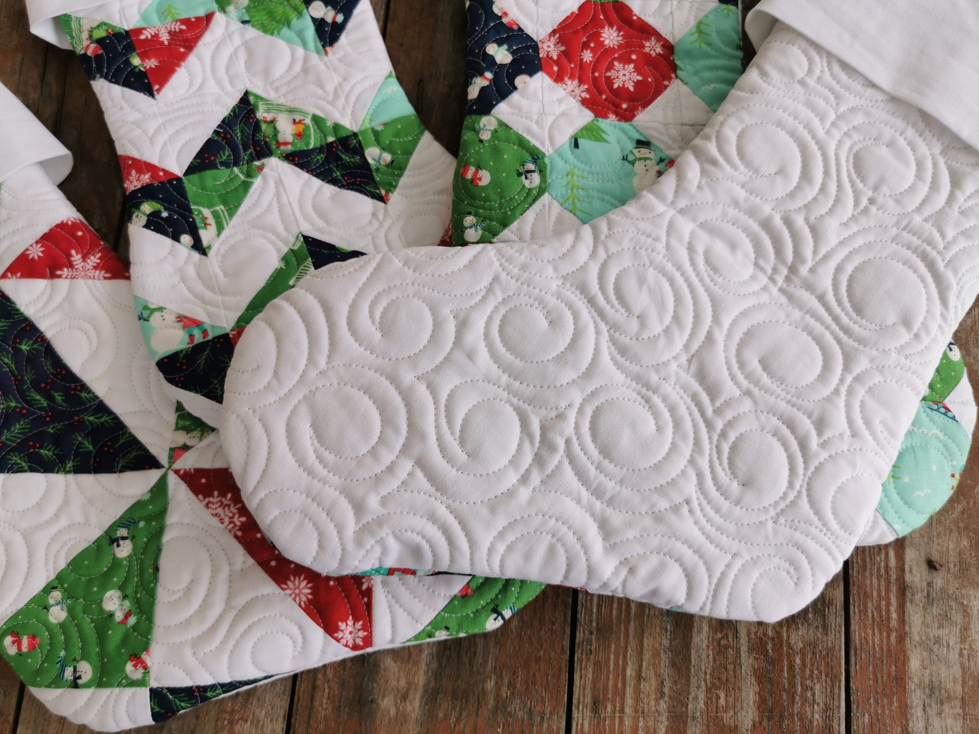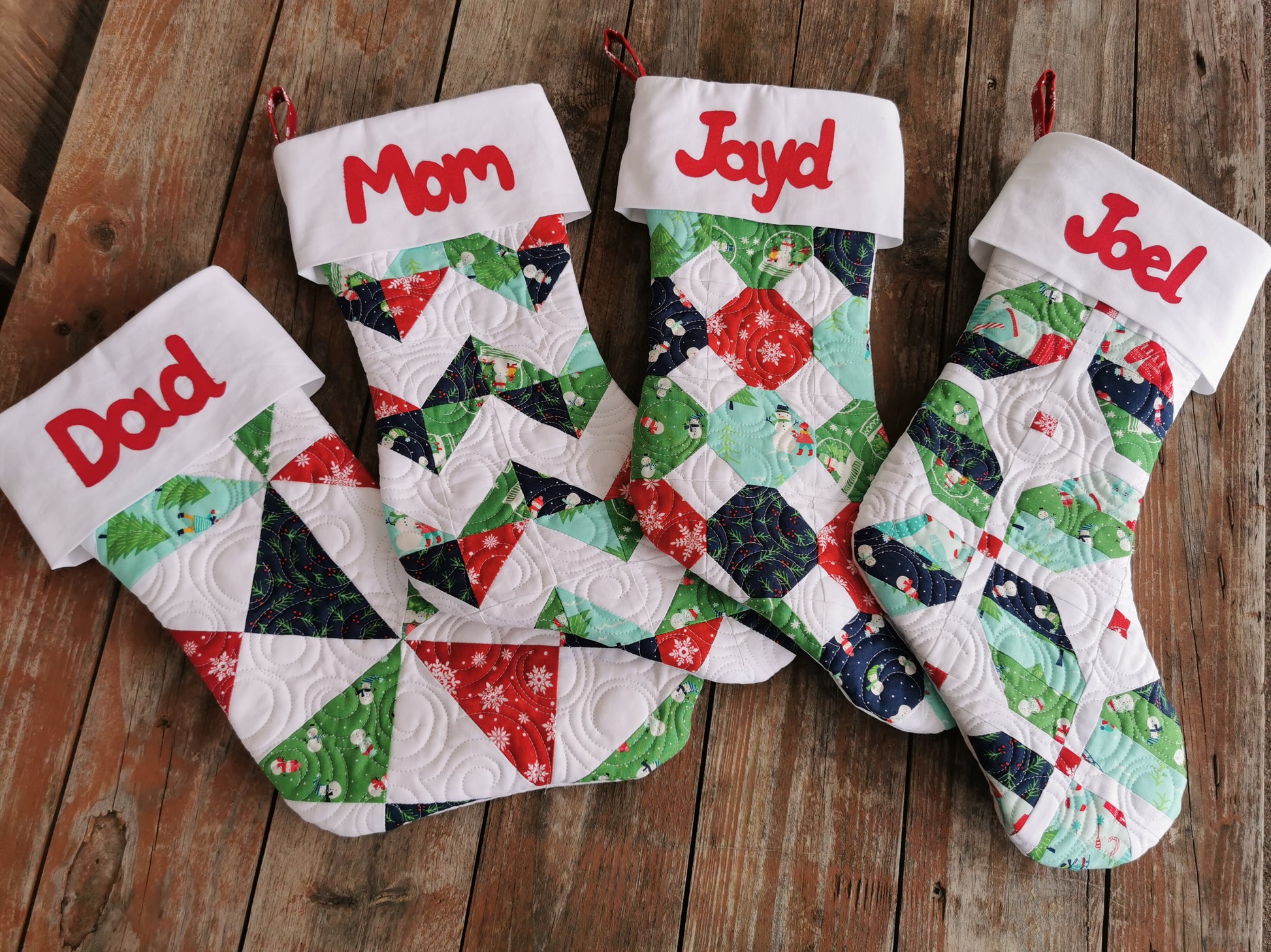 Four quilted Christmas stockings in coordinating fabrics, with personalization. Pieced fronts.
