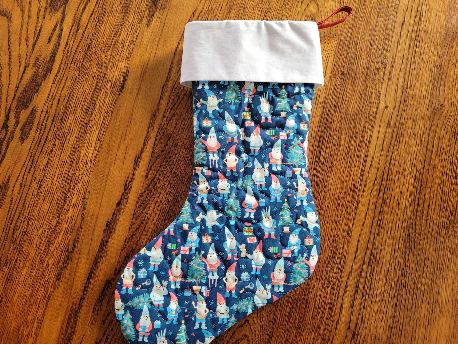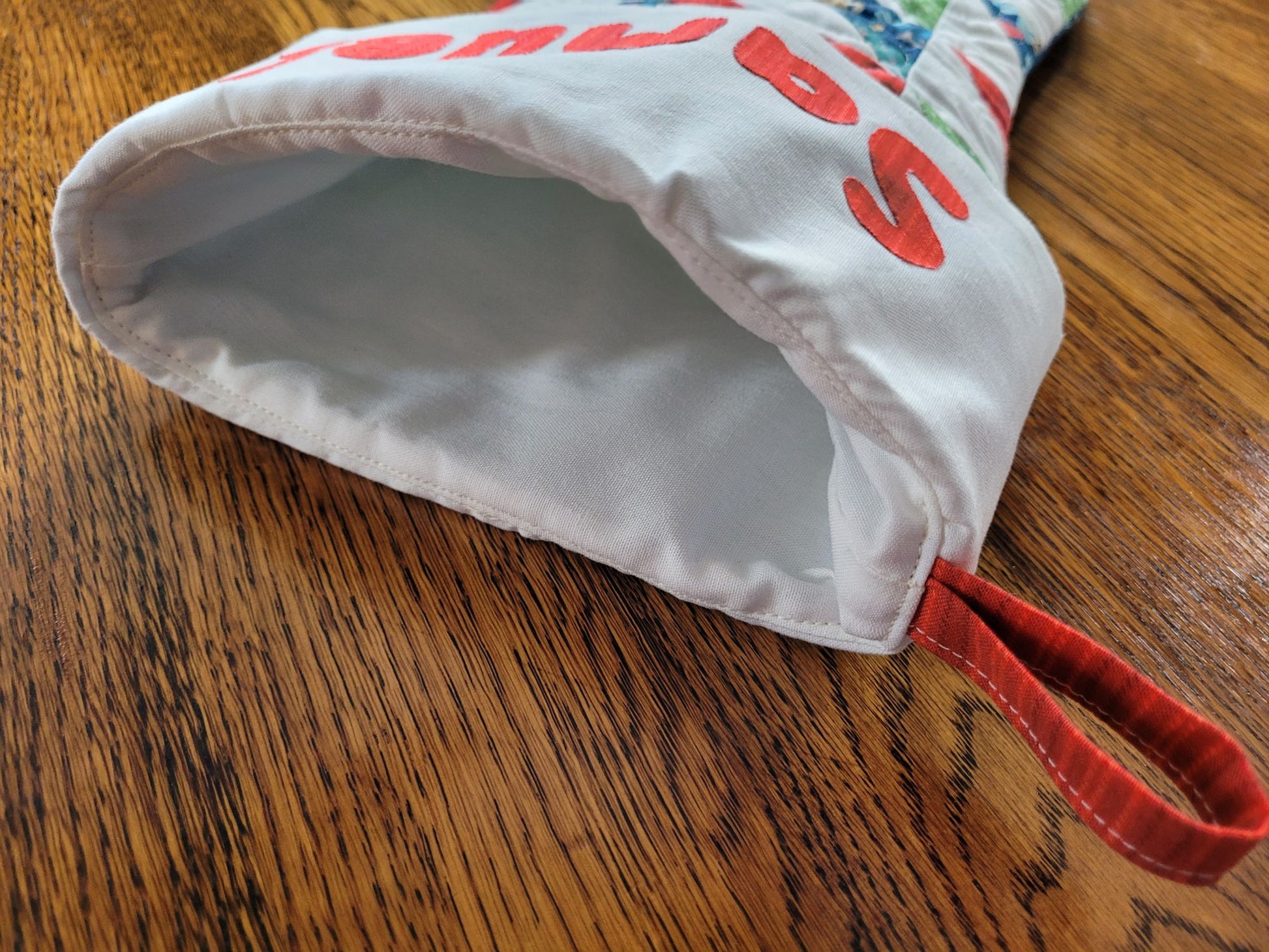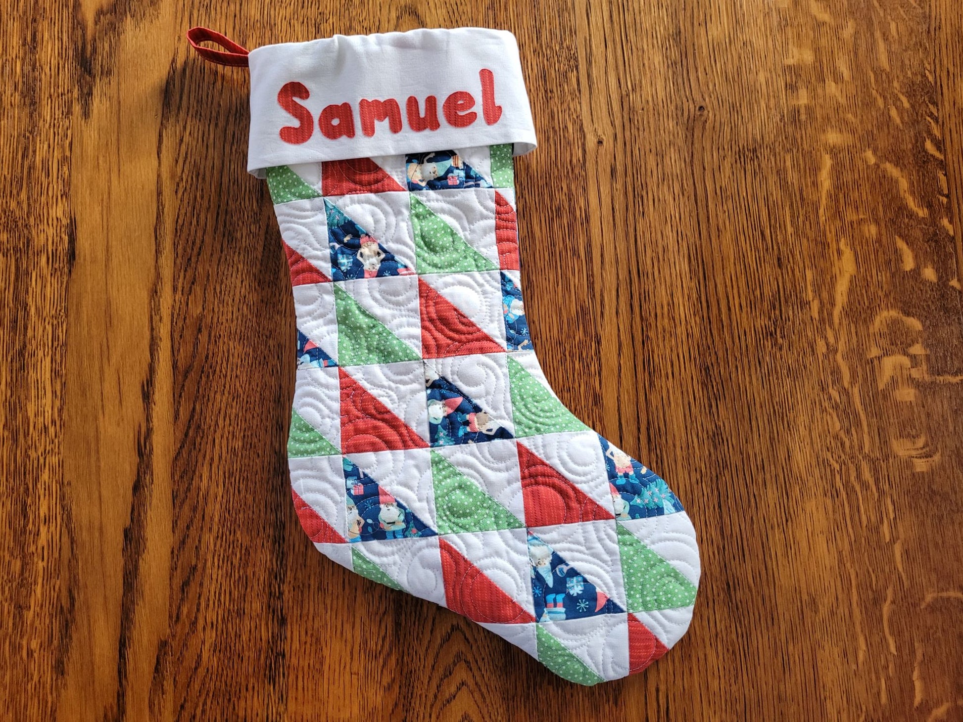 Patchwork scrappy triangles in blue, green, red on white background. Blue fabric is Christmas themed with little Elves, trees and gifts. Thia fabric is uswd gor the back. Freemotion quilting, lined, hanging loop, and cuff with iron on letters for personalization.