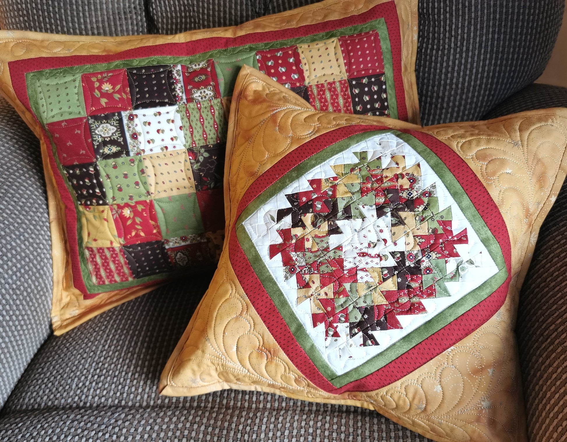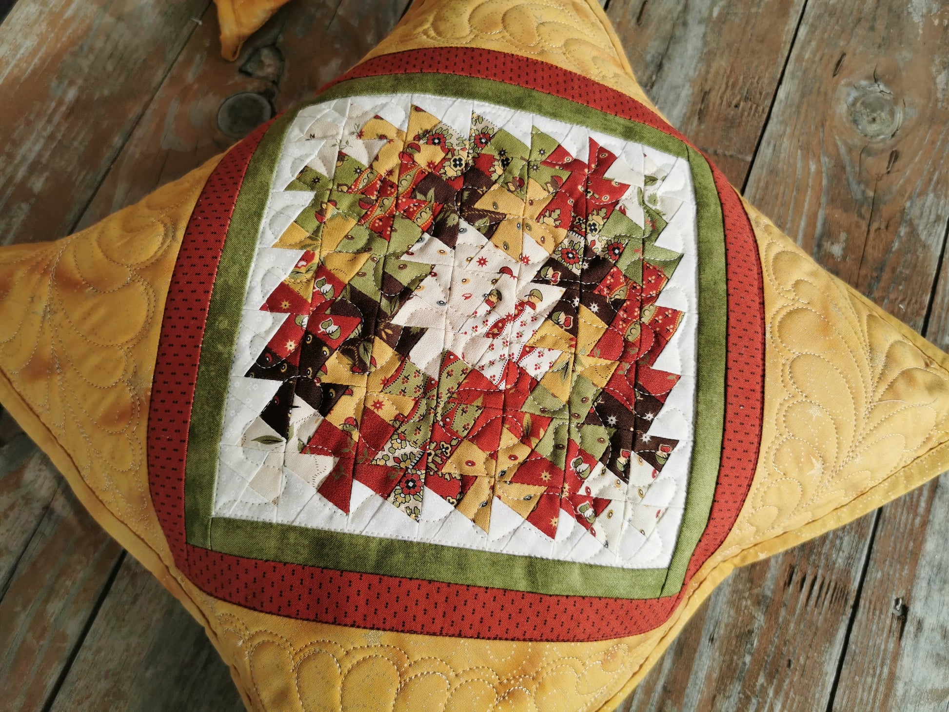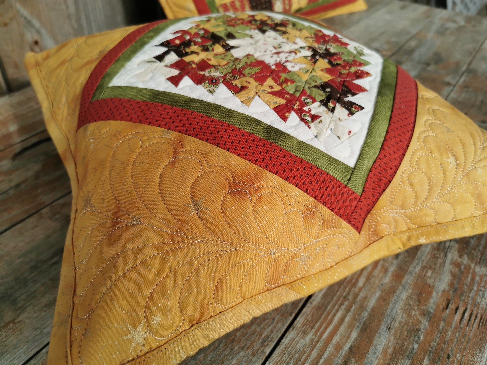 This custom pillow has a number of special features. The rich gold fabric has subtle metallic stars throughout, the mini twister wreath in the centre of the pillow is intricate and fun to look at. The beautiful feather quilting adds pretty texture and an appealing plush look.