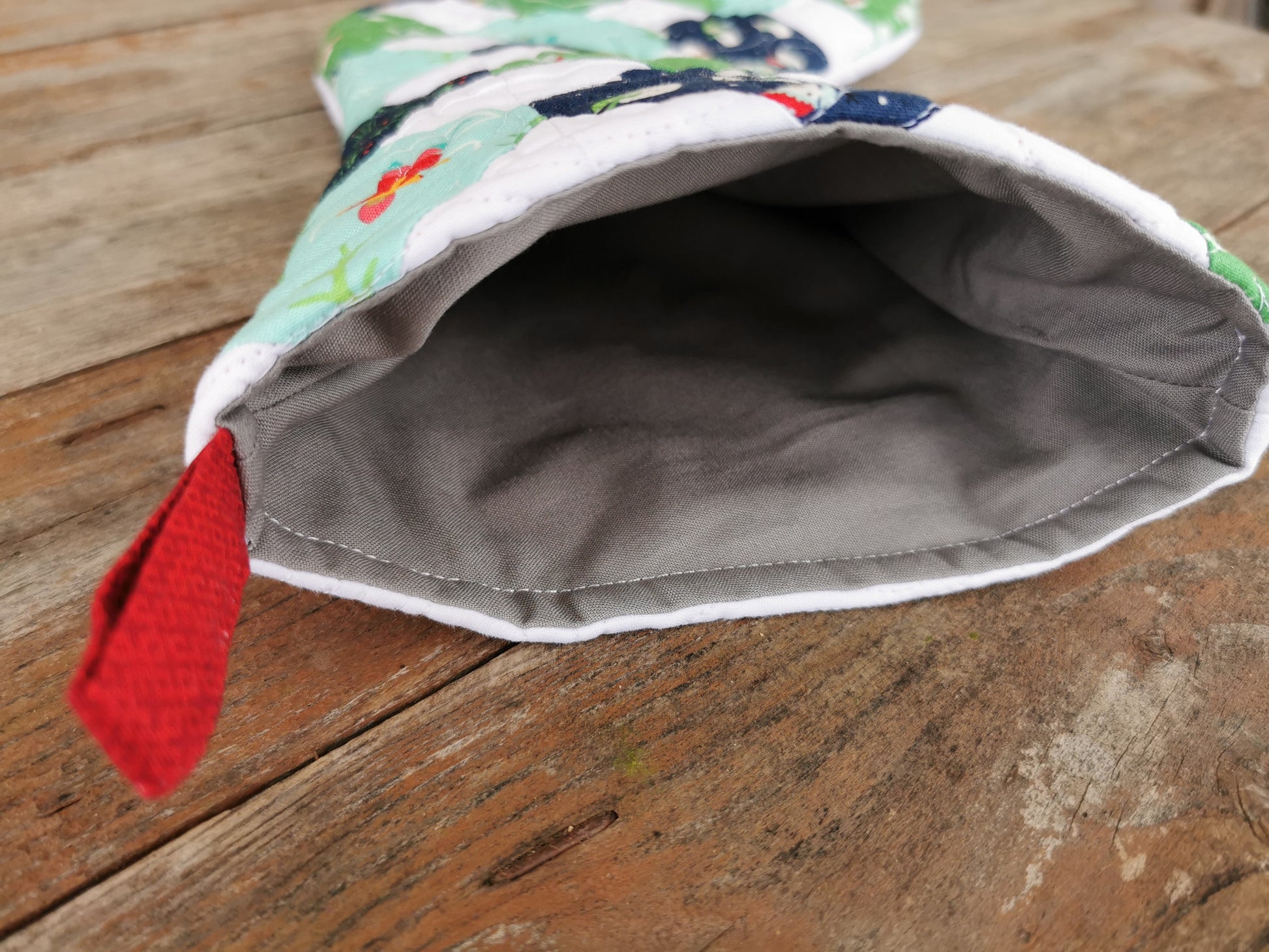 This patchwork stocking front uses coordinating, winter themed fabrics in navy blue, green, ice blue, white and red. The backing is pure white, which makes the quilting shine.