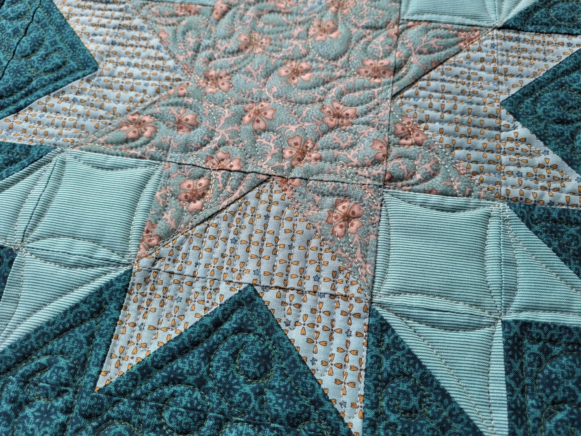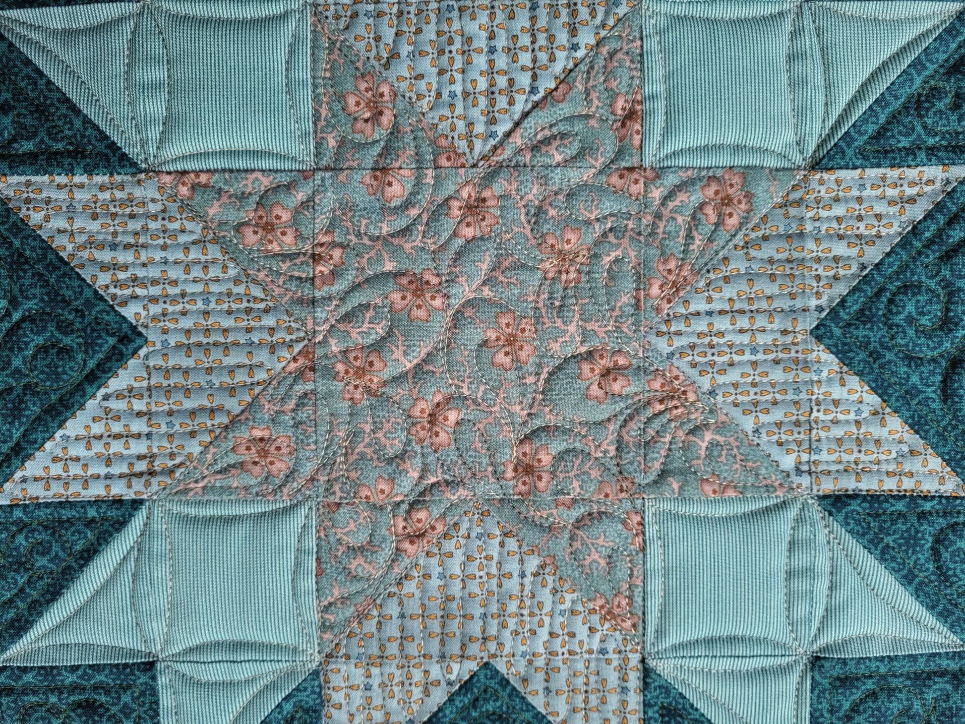This beautiful teal star mini quilt can be used on a table or as a wall hanging. Lovely quilting detail is done by freemotion. This is a machine quilting technique where the design is created according to the whim and skill of the operator rather than by computer. It is accomplished by freely moving the machine around on the project to stitch out their vision.